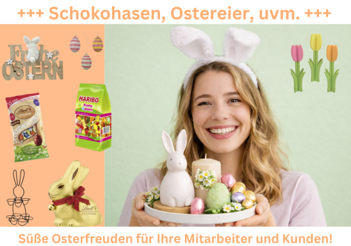 Ostern ist die Zeit für kleine Aufmerksamkeiten. Für ein Dankeschön im Team, ein Lächeln am Empfang oder eine sympathische Geste für Ihre Kunden. Mit unseren Oster-Highlights bringen Sie genau das dorthin, wo es zählt – und machen Wertschätzung ganz einfach sichtbar. Ob der klassische Lindt Goldhase, beliebte Milka-Spezialitäten oder fruchtige …